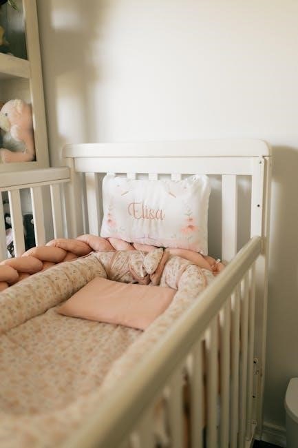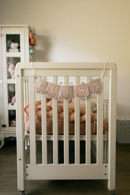 Attach the headboard using the provided bolts and Allen wrench, tightening them securely. Repeat this process for the footboard, attaching it to the bottom of the side rails. It’s crucial to ensure both the headboard and footboard are firmly connected to provide stability to the crib structure.